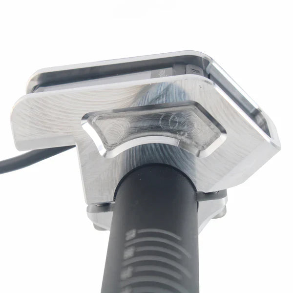 Solid one-piece 6061 billet aluminum protective case for EggRider display. This rugged case protects the fragile EggRider from damages as well as replaces the plastic bar clamp with an all-aluminum 2 screw clamp (similar to brake lever clamp).