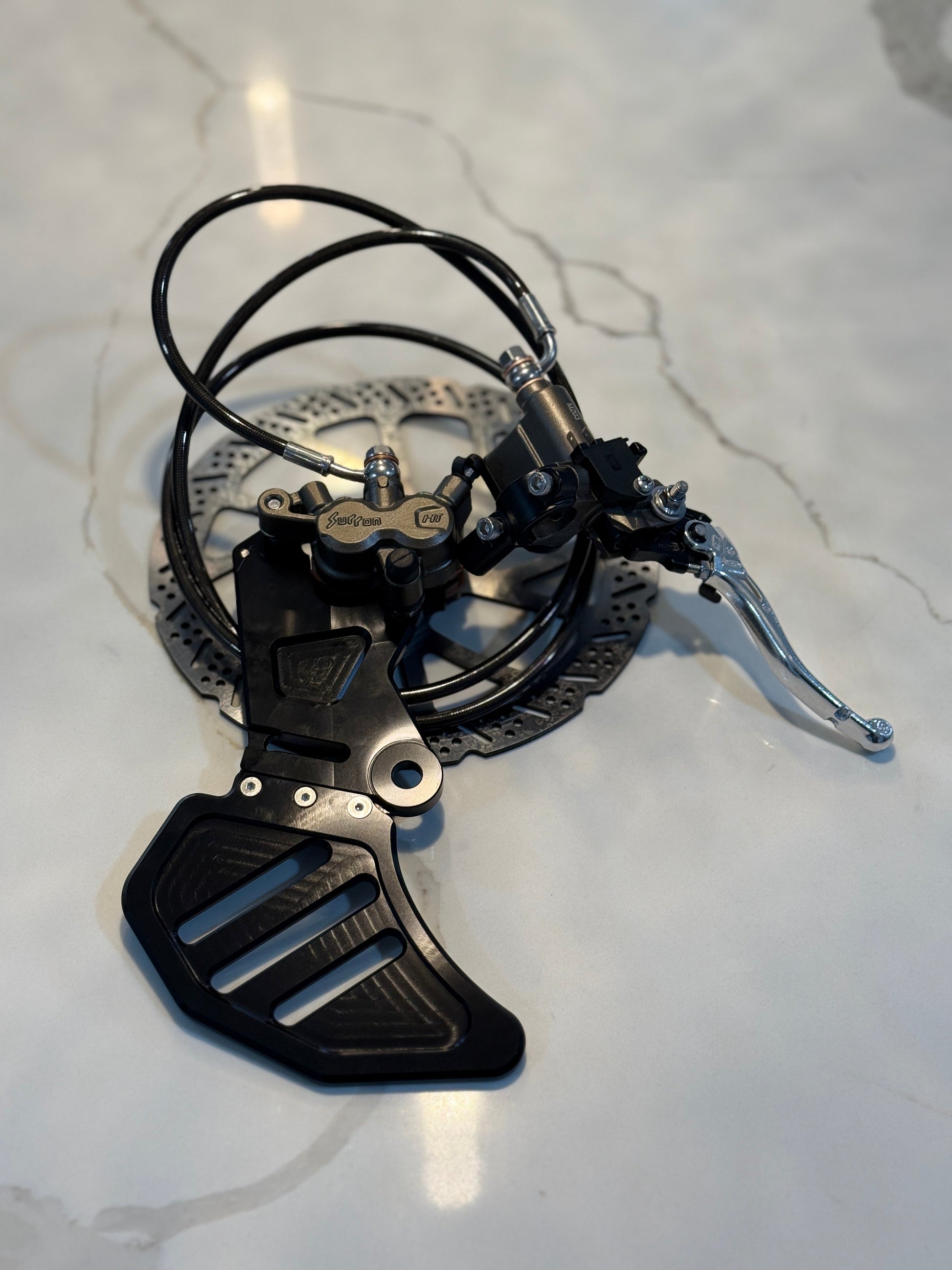 The Ultra Bee rear brake kit features a rear Ultra bee brake, necessary adapters, and a 240 mm rotor. Compatible with models such as Surron LBX/s. and Eride Pro Ss 1.0/2.0, it delivers reliable stopping power. Pre-assembled and pre-bled, this kit ensures a straightforward, time-saving installation.